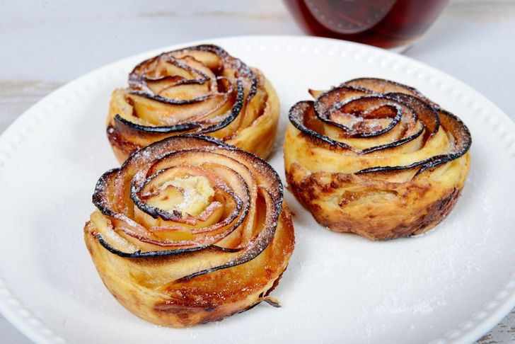 1- Cortar las manzanas peladas en láminas finas. 2- Estirar el hojaldre, pintar con mantequilla y espolvorear azúcar moreno. 3- Colocar la manzana sobre el hojaldre hecho tiras, y enrollar para que quede forma de flor. 4- Hornear a 180º C hasta que el hojaldre se dore 5- ¡Tus tartaletas ya están listas!